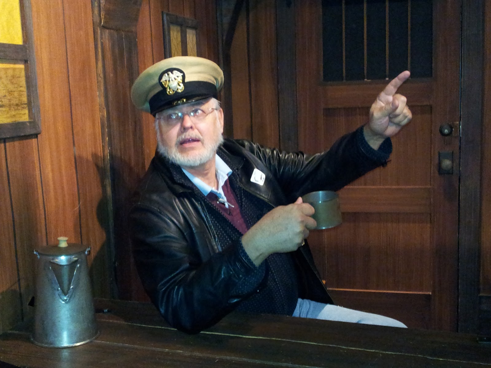 Now we have a shot of me, apparently explaining about some incoming kamikaze, pointing to a fly on the bulkhead or merely boring someone with a tale of "back in the day."